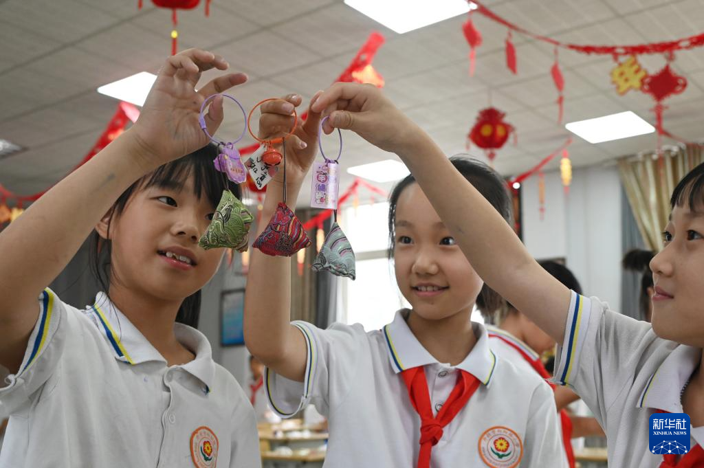 6月5日,河南省開(kāi)封市向陽(yáng)路小學(xué)的學(xué)生展示自己制作的香囊。