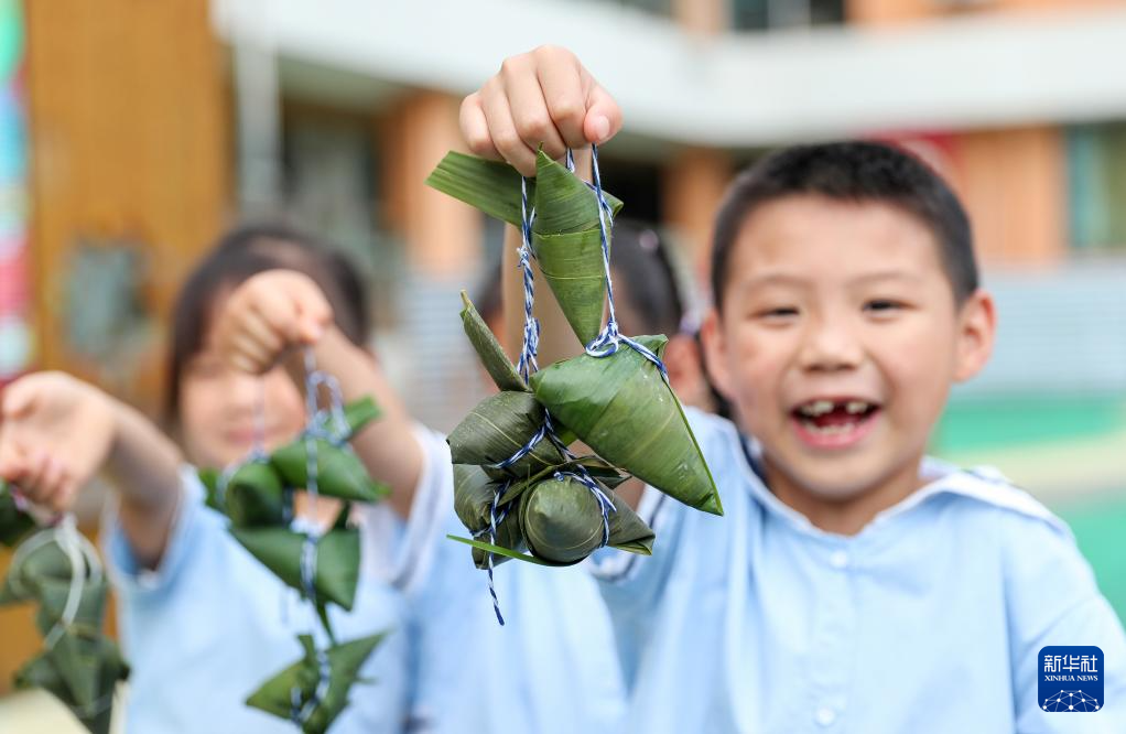 6月5日,四川省華鎣市杜家坪幼兒園的小朋友展示自己包的粽子。