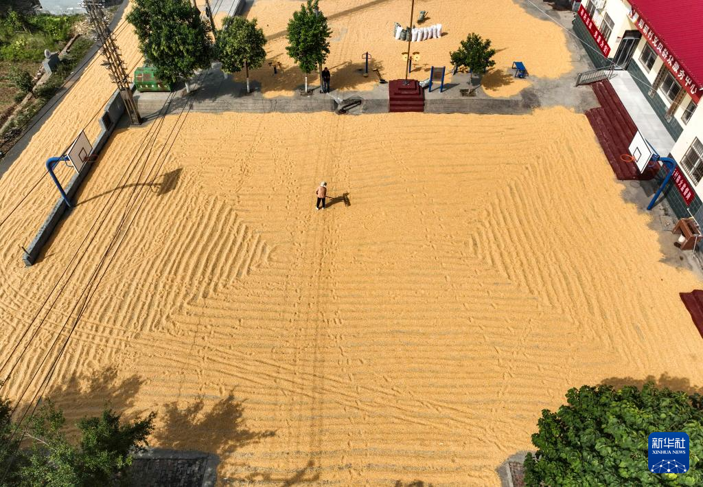 10月4日,河南省濟(jì)源市克井鎮(zhèn)勛掌新村農(nóng)民在晾曬玉米(無(wú)人機(jī)照片)。