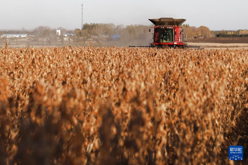 10月3日,在北大荒集團(tuán)黑龍江紅星農(nóng)場(chǎng)有限公司第四管理區(qū)有機(jī)大豆種植基地,大型收割機(jī)在進(jìn)行收獲作業(yè)。