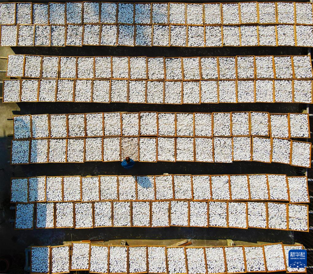 10月4日,在安徽省安慶市岳西縣響腸鎮(zhèn)千佛塔村,村民在曬茯苓(無(wú)人機(jī)照片)。