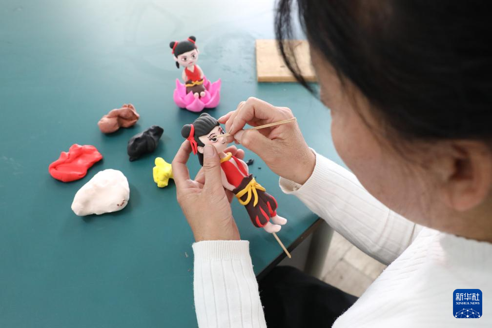 2月20日,泥塑藝人楊?lèi)?ài)華在山東省濱州市的一所小學(xué)創(chuàng)作哪吒主題泥塑。