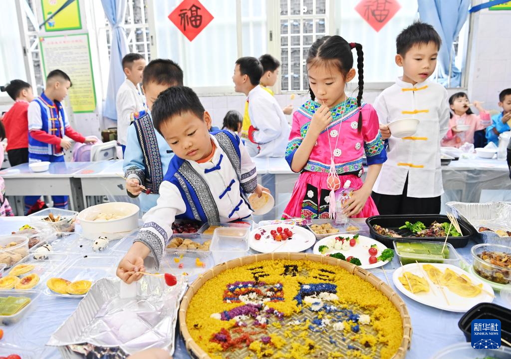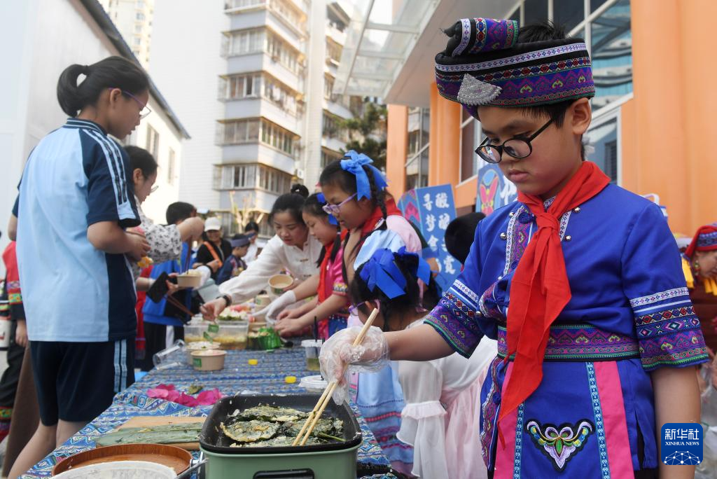 3月27日,孩子們?cè)趶V西南寧市民族大道東段小學(xué)品嘗傳統(tǒng)美食。