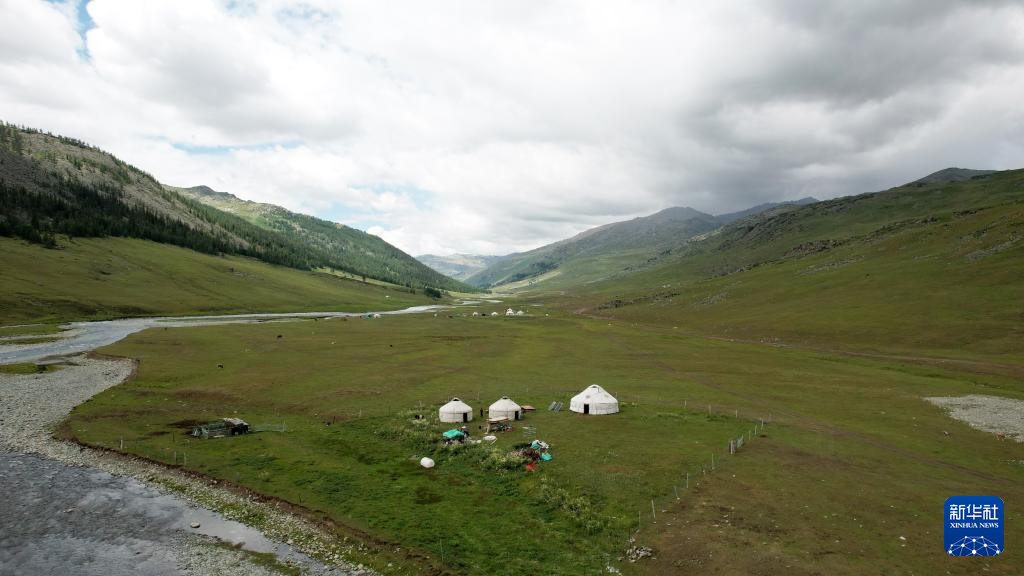 7月2日,在新疆阿勒泰市野卡峽,剛剛轉場而來的牧民們已搭建好氈房(無人機照片)。