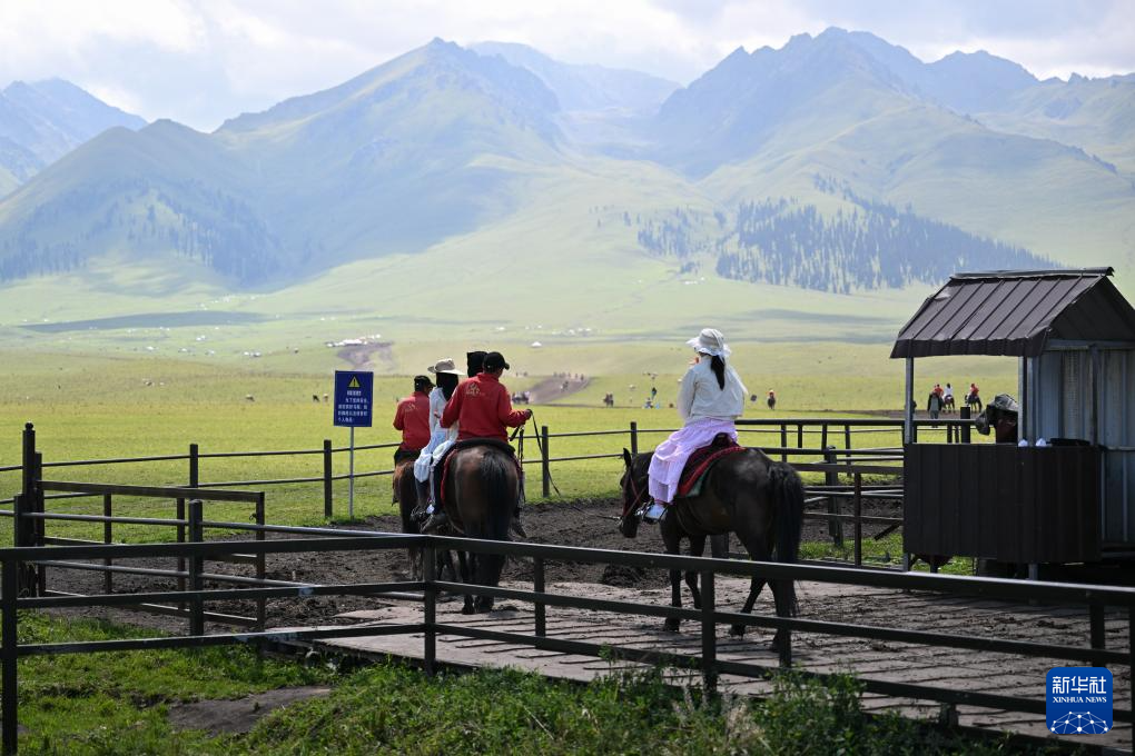 8月3日,游客在那拉提草原騎馬游覽。