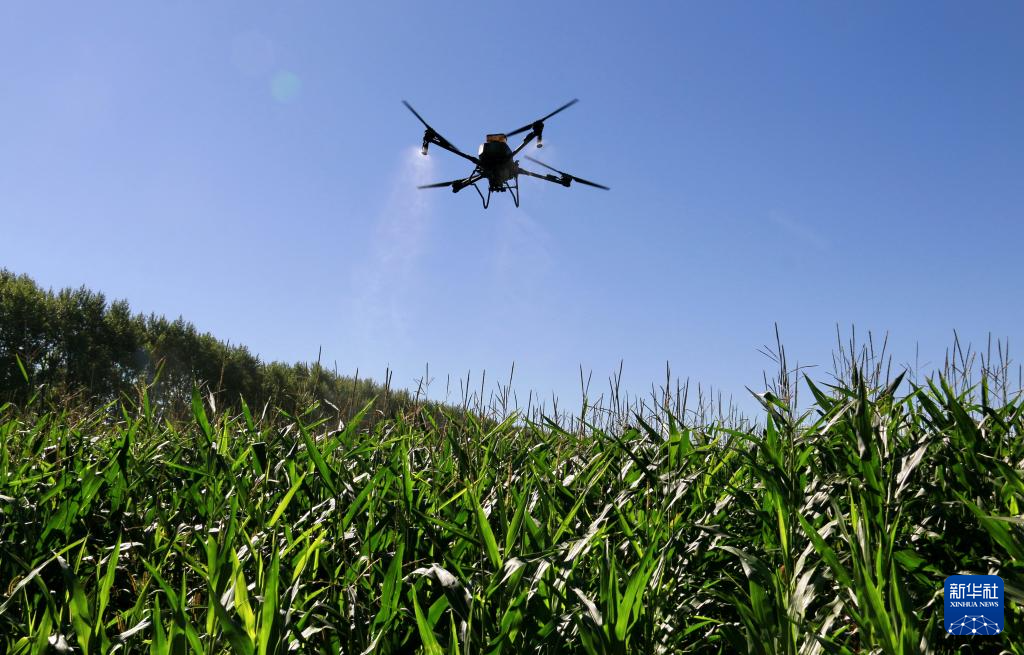 8月7日,在北大荒集團(tuán)黑龍江格球山農(nóng)場有限公司第二管理區(qū),一架植保無人機(jī)為玉米噴施“營養(yǎng)液”。