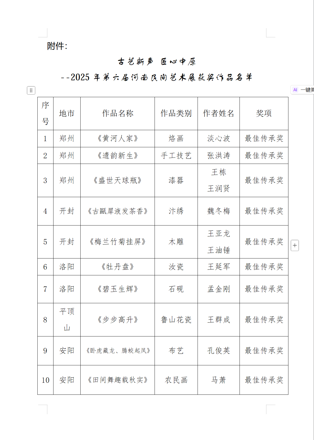 據(jù)悉,根據(jù) 2025 河南惠民文化活動總體安排,河南文化館組織開展的第六屆河南民間藝術展作品征集工作,經全省縣、市各級推薦,共收到作品 30 類 1500 余件。經專家評審,共評出最佳傳承獎20 個,優(yōu)秀獎40 個,別具匠心獎60 個,榮譽參展獎20 個。(漯河市廣播電視臺網絡部記者:柴全偉)